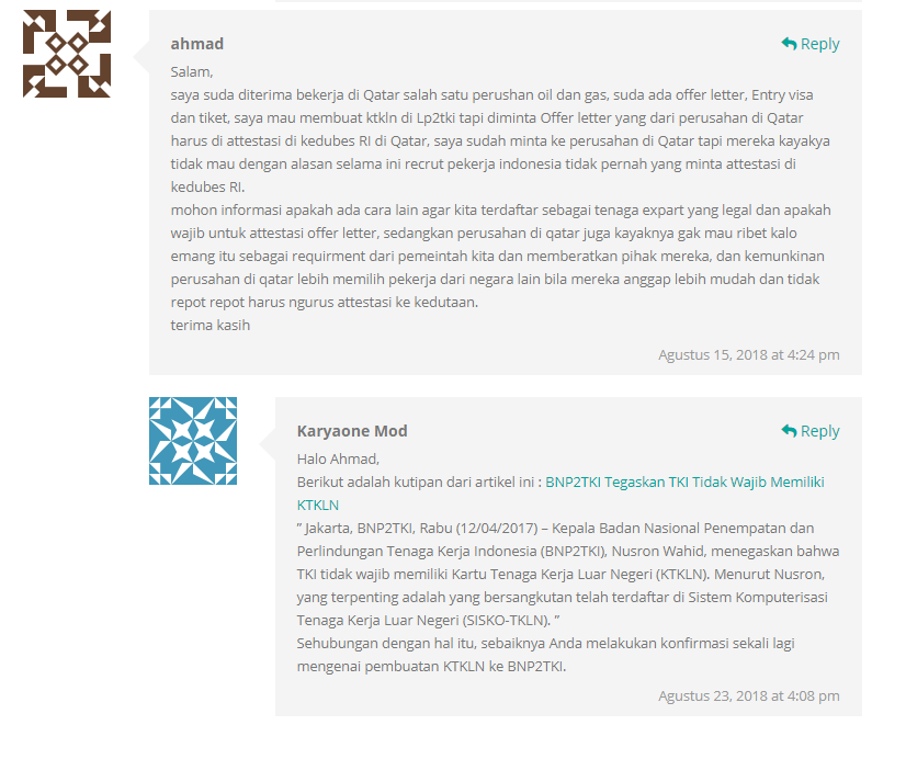 Berdasarkan pengalaman saya sendiri, pihak perusahaan bersedia untuk mengajukan attestasi offer letter saya di Kedutaan Besar Indonesia. Hal ini memakan waktu sekitar 1 (satu) bulan lamanya. Kendatinya, kesulitan saya untuk mendapatkan E-KTKLN tidak berhenti di situ saja. Pada saat proses pengurusan E-KTKLN, pihak BNP2TKI mempertanyakan keabsahan e-visa kerja saya, lagi-lagi proses ini memakan waktu 3 hari lamanya, yang pada umumnya hanya memakan waktu 1 (satu) hari saja.